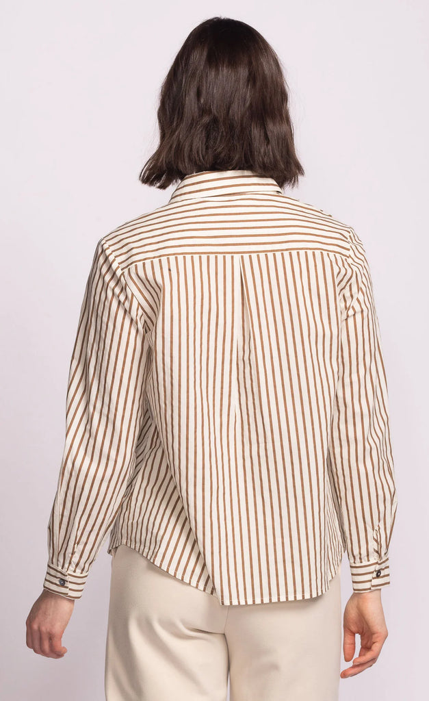 The Sapphire Top is a striped button-up shirt with pearlized buttons. Designed with a classic collar, buttoned cuffs, it's a versatile staple that can be layered under a sweater for a preppy look or worn on its own with jeans for effortless everyday style.