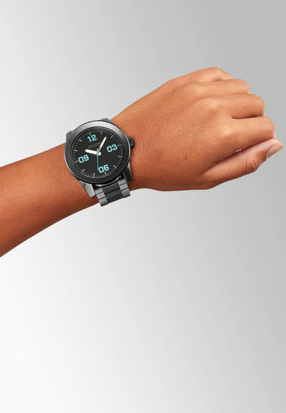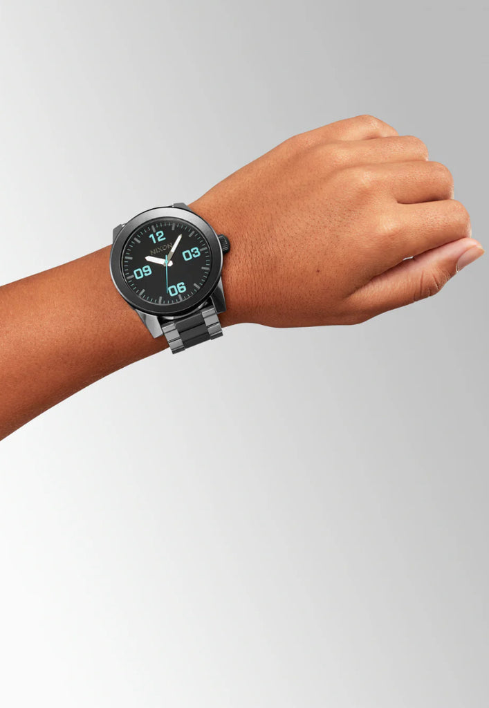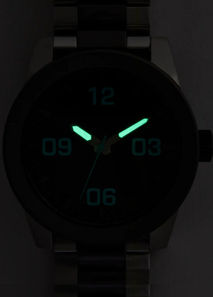 The field watch with a clear, tactical advantage. The face is protected by a recessed crystal and the oversized bezel brings out the best in rugged durability. Its functional design combined with details like faceted links that look like a mountain range when viewed from the side means the Corporal always has the high ground.