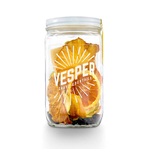 Cocktail Kit includes: ready for infusion 32oz glass jar with Pineapple, Orange, Apple, Blueberries and Citrus Infused Non-GMO Vegan Cane Sugar.