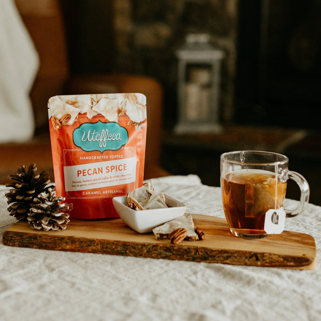 Pecan Spice Utoffeea combines layers of crunchy cinnamon toffee, premium roasted pecans, and white chocolatey goodness - with a subtle hint of cayenne pepper. Perfectly balanced and totally delicious, it’s the perfect sweet treat for any occasion!