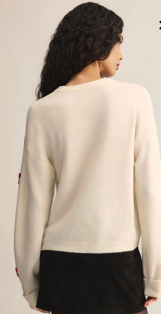 Playful yet cozy, this crewneck sweater is finished with delicate bow embroidery across soft yarns. Its relaxed fit makes it the perfect festive layering piece.