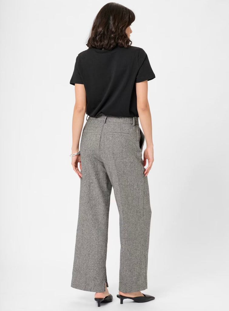 Wide-leg trousers with a straight silhouette, tailored waistband and subtle front slits at the hem. Herringbone texture adds refined dimension to the design.