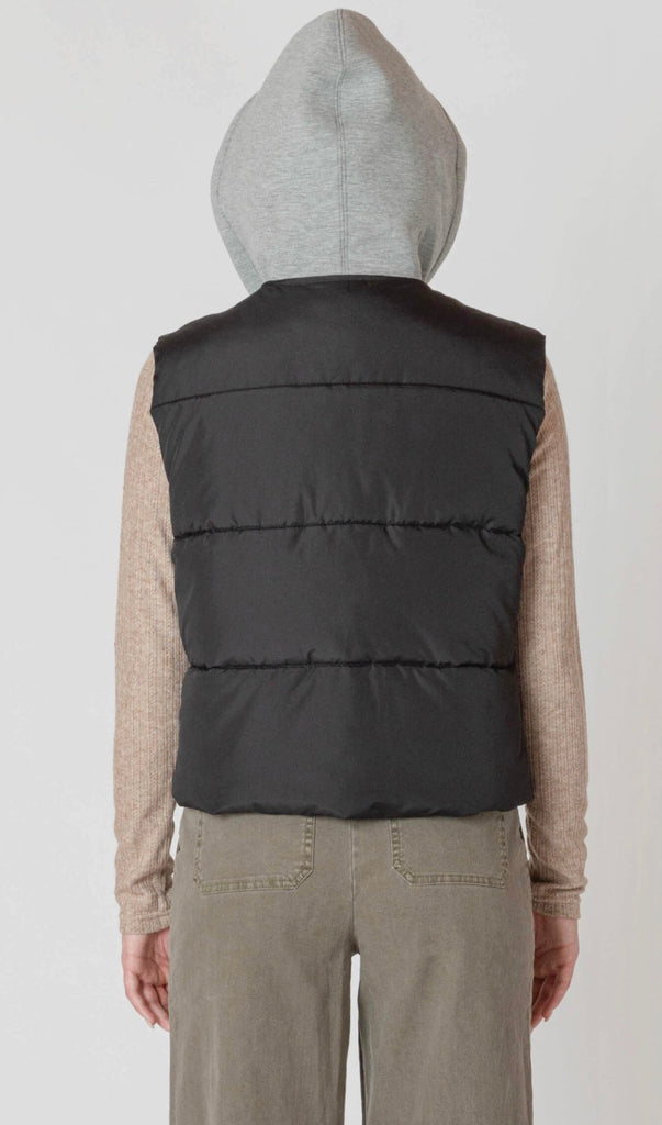 This puffer vest features a faux removable hoodie insert that gives the look of layered pieces without the bulk. The grey hood & zip-up detail add a casual, sporty vibe, while the vest’s snap-button and zipper closure keep you cozy on cooler days.