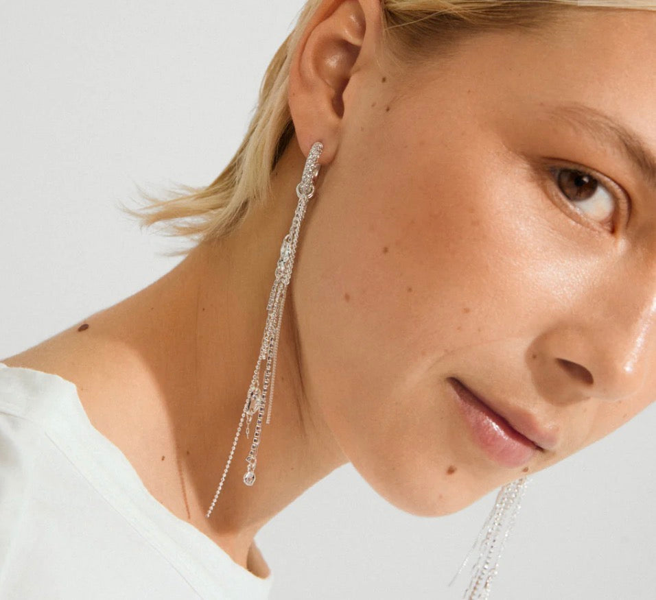Dripping in dreamy details! The silver-plated DRUE earrings from Pilgrim are the ultimate go-to when you want to add a hint of effortless luxury to your look. The small hoops with Preciosa crystals blend with a cascade of chains and fine pendants, creating a playful, free-minded expression with a breezy feel. Perfect for days when you want to embrace your inner boho goddess and let the details speak. Style them with a flowy maxi dress, bare shoulders, and a touch of sunkissed skin for a dreamy, luxe bohemian look. Made from 77% recycled material – fashion with care!
