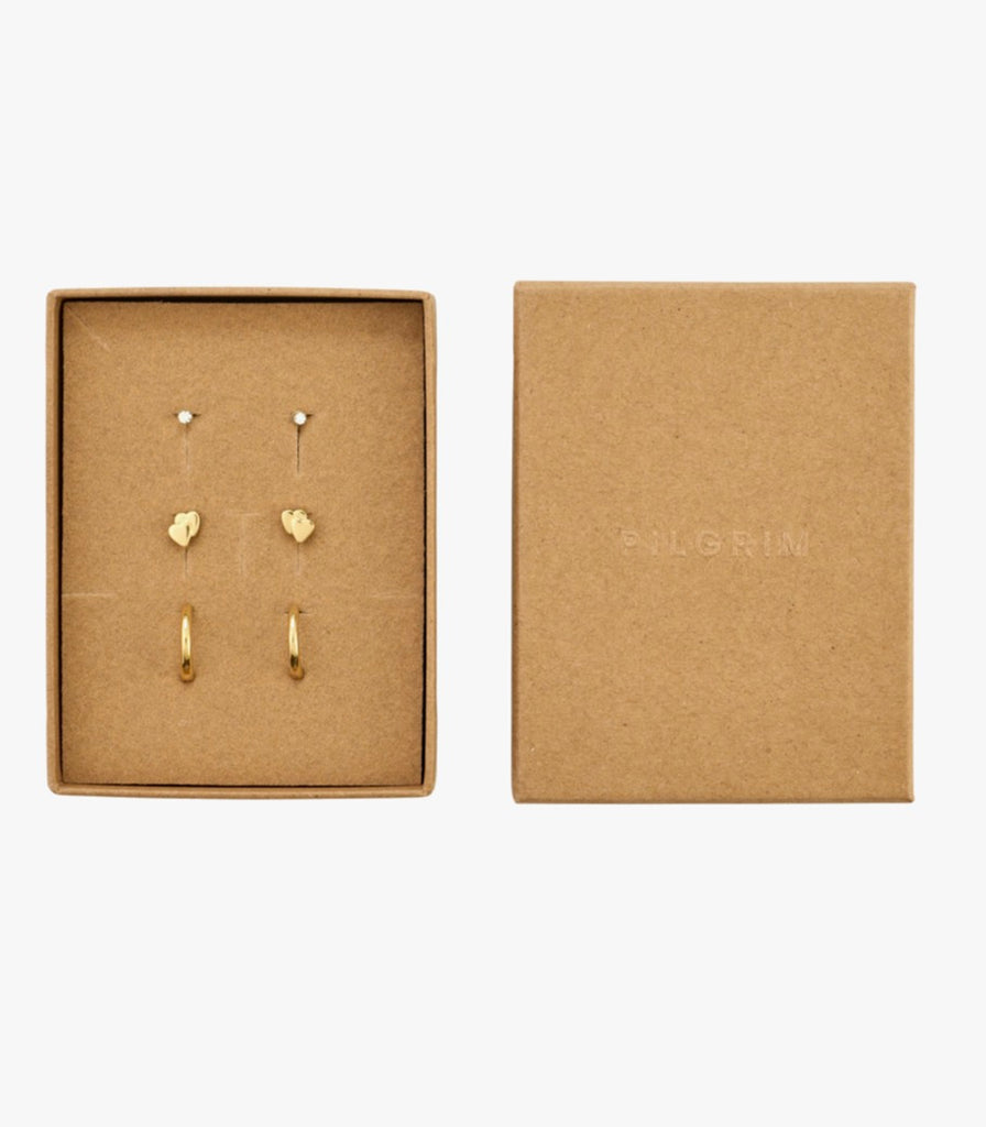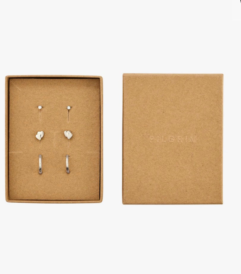 Three times the charm! This gift set includes three pairs of earrings, offering endless styling possibilities. The set includes sparkling Preciosa crystal studs for a touch of class, small romantic hearts for a sweet vibe, and classic huggie hoops with an easy-to-use click clasp for effortless coolness. Perfect as a thoughtful gift or as a must-have for both everyday looks and glam occasions! The set is crafted from 94% recycled material, showing consideration for our environment.