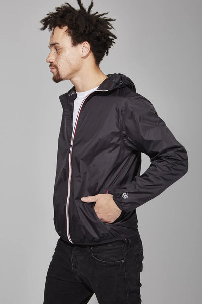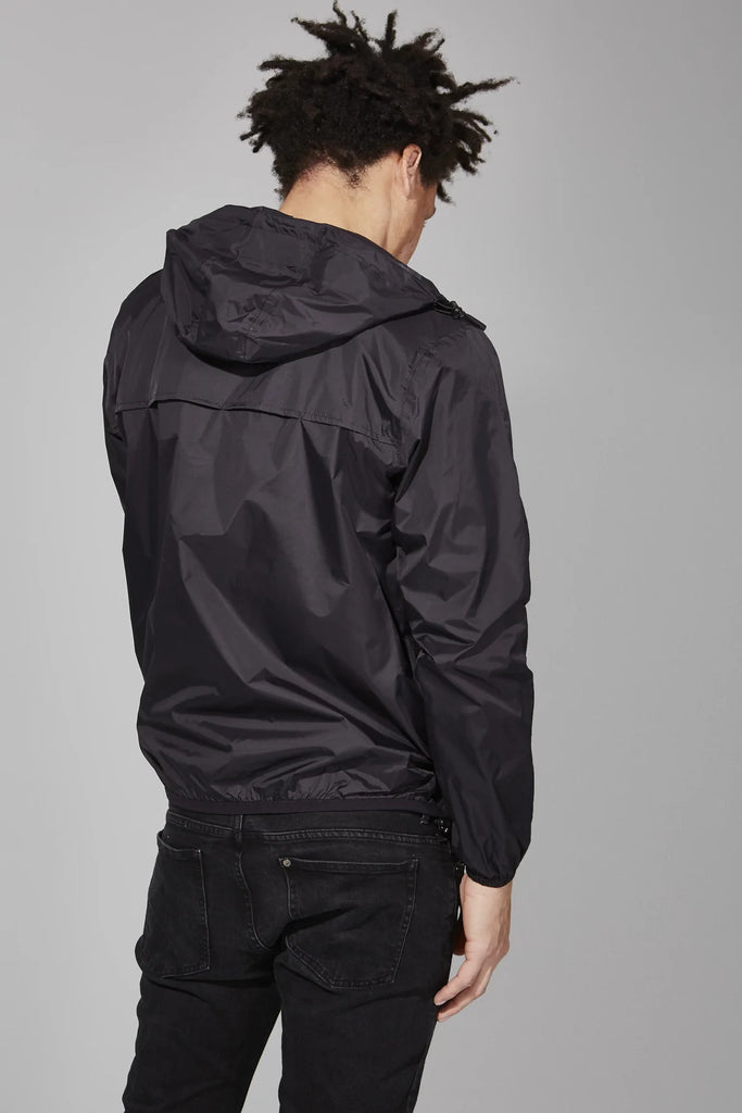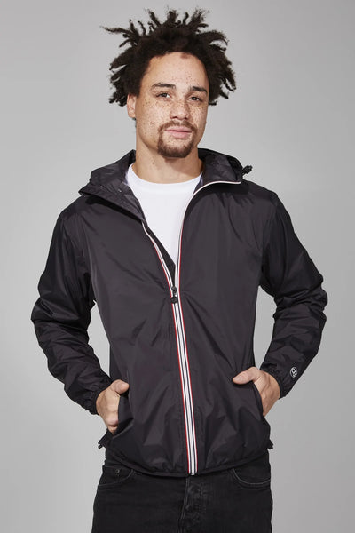 Black full zip packable rain jacket and windbreaker