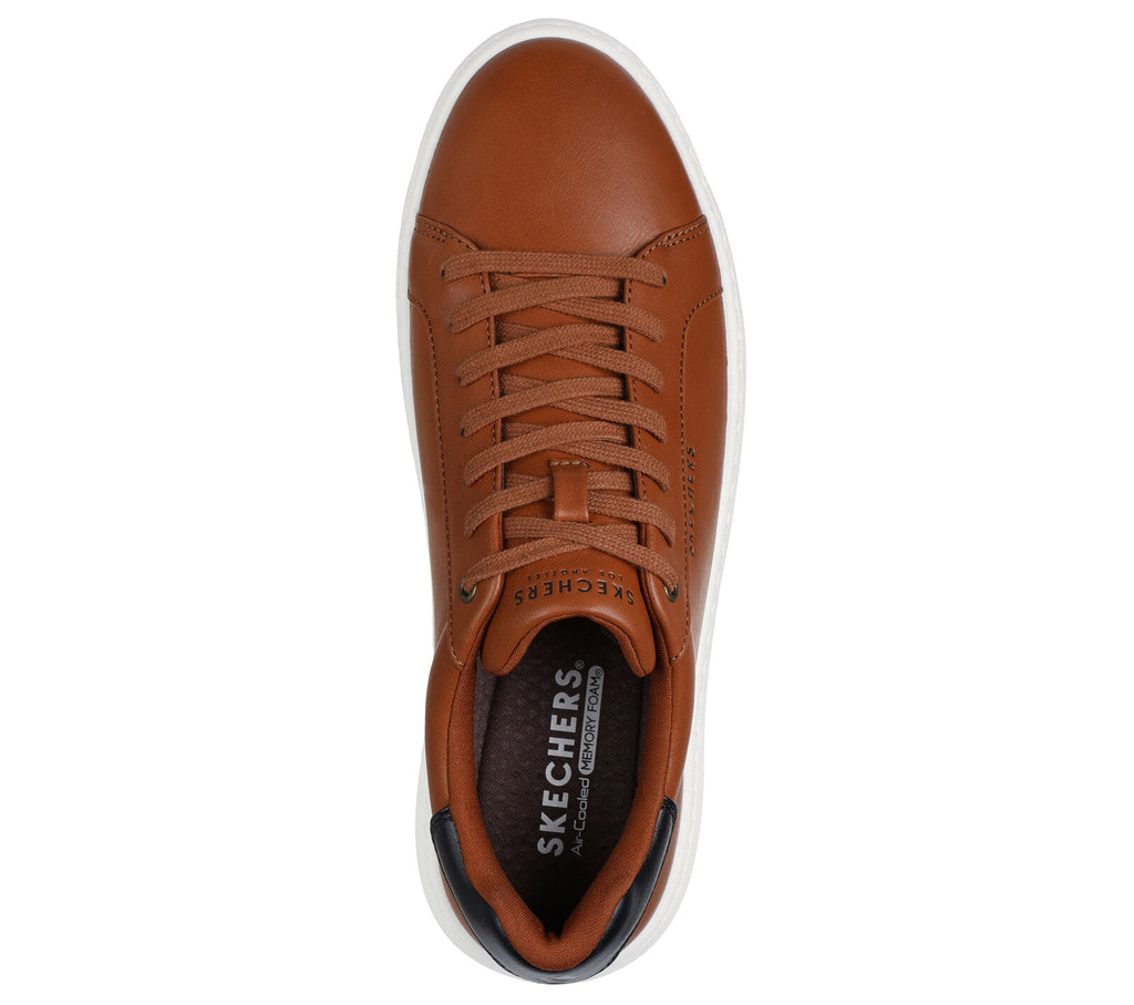 Elevate your wardrobe and look sharp with the comfortably versatile Skechers Court Break - Suit Sneaker. This lace-up features a synthetic duraleather upper with fixed stretch laces and a cushioned Skechers Air-Cooled Memory Foam® comfort insole.