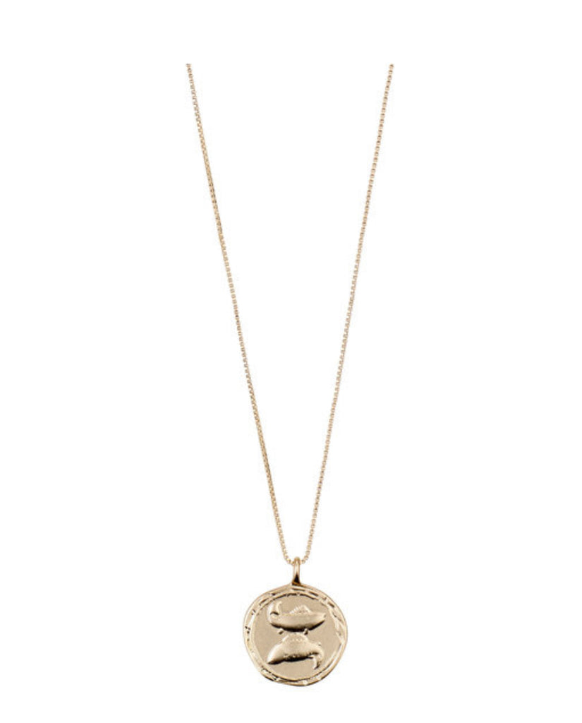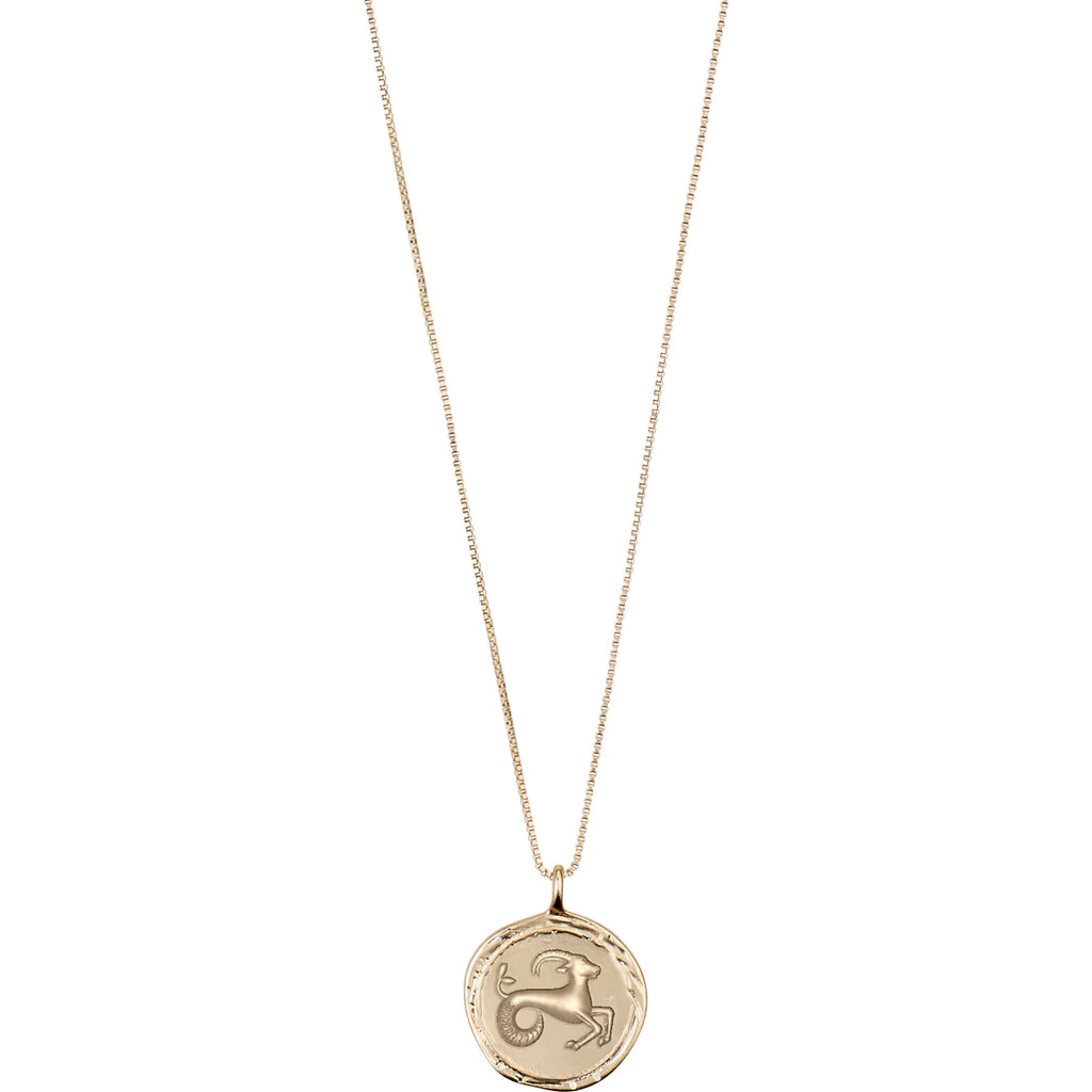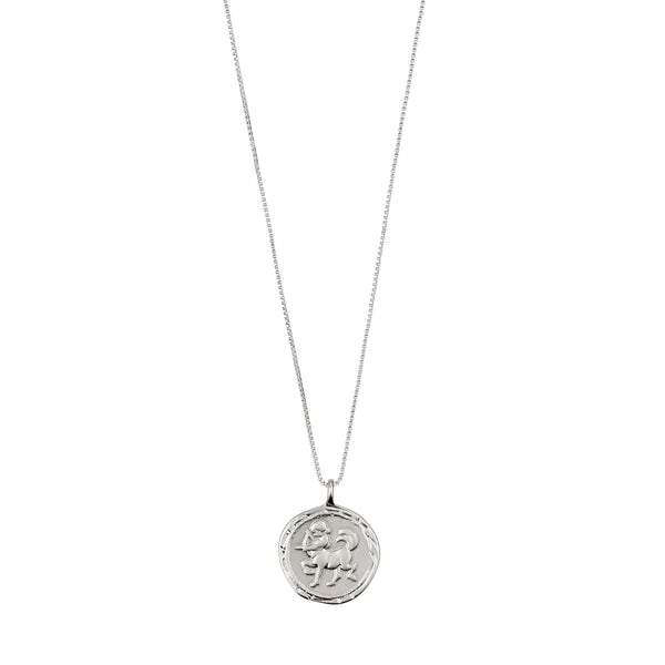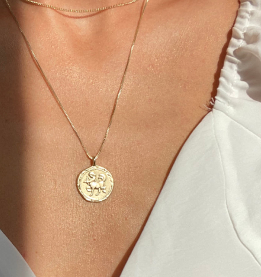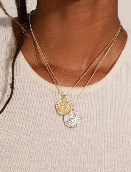 One side of the medallion is debossed with an astrological symbol, representative of each sign, while the other side is set with sparkling crystals representing the constellation in stars.