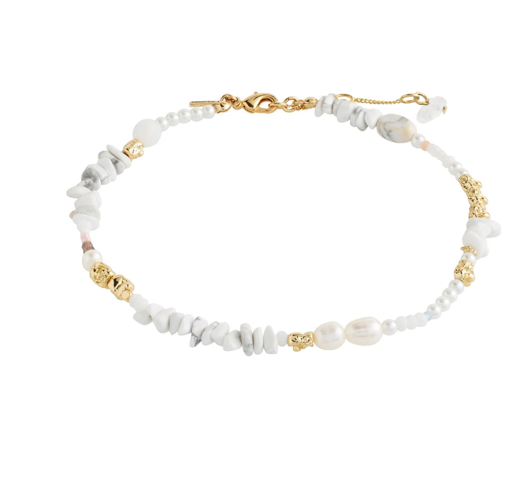 Feel the force, with Pilgrim's FORCE anklet! Get into the laid-back and free-minded summer vibe when you wear the boho-inspired ankle chain. White turquoise stones, in combo with genuine freshwater pearls, give the chain a beautiful playful mix with organically formed, gold-plated or silver-plated details. A must have for sunkissed ankles and beachy flip-flops. The chain measures 25 cm + 3 cm extension chain.