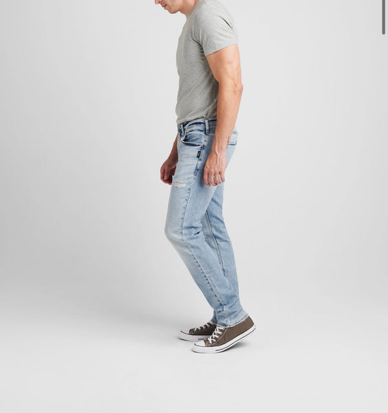 - Slim leg jeans with a distressed light indigo eco wash that uses less water, chemicals and energy
