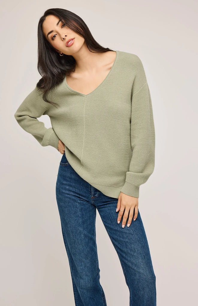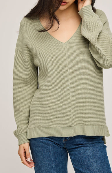 The Lisbon sweater is made of a soft yarn in a waffle knit pattern. Features include side slits and exposed seam details.