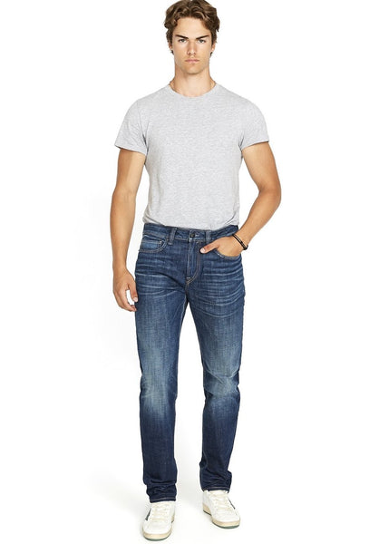 Stretch recycled denim jeans in a sanded dark blue wash. Inspired by an active lifestyle, these jeans feature a comfortable low-rise waist with a relaxed fit at the leg and a tapered hem. The distressed design gives this staple piece a worn-in feel. The signature maple leaf graphic is debossed at the zip-fly.
