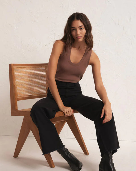 Our Sirena Rib Tank is made in our Premium Feather Rib fabric. We love this fitted tank tucked or untucked and the white option is semi-sheer.