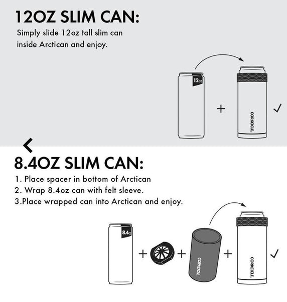 Slim Arctican, that is. Our best-selling Arctican has been elongated to snugly fit your favorite seltzers, specialty beers and other beverages. Simply freeze the cooling core base, twist it on, drop in a cold 12oz canned beverage and enjoy ice cold drinks, anytime. Have an 8.4oz slim can? Slim Arctican comes with a felt sleeve and easy-slide spacer. Simply wrap the sleeve around your 8.4oz can, insert the spacer into Arctican’s base and voilà — you’re ready to sip in style.