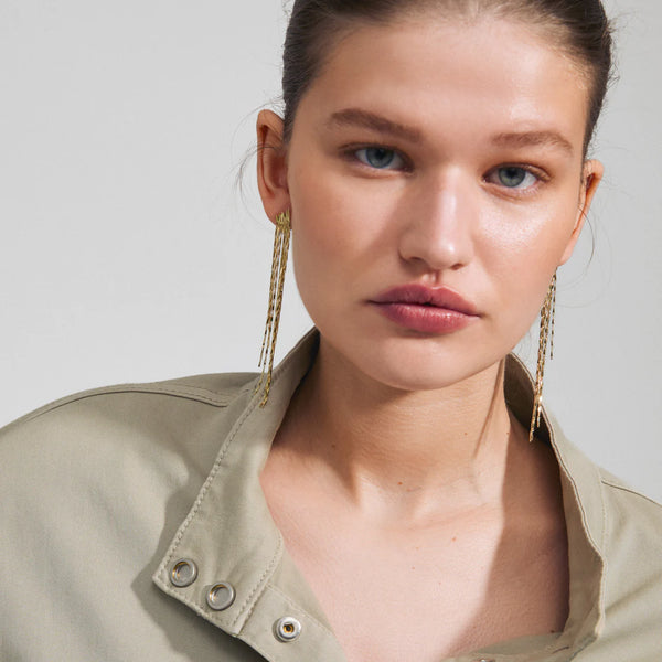 Embrace the simple beauty! ZENOBIA earrings are your secret to a dazzling look. Layered gold-plated chains create a dreamy waterfall effect that sparkles at every twist n' turn on the dance floor. The earrings' twisted melon seed links are designed to catch the light and are perfect as your go-to party piece when the spotlight hits you. Made from 97% recycled materials, they're a styling choice you can be proud of.